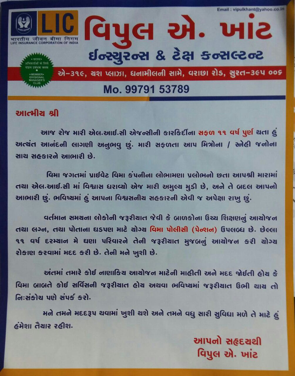 Some people may think of life insurance as just another expense. The question you need to consider is would someone in your life suffer an economic hardship if you were to die? If your answer is yes, then life insurance is important for you to have. If you're wondering why life insurance is important, stop to consider the potentially devastating consequences of not having coverage to financially protect the people that you love. Your one call to Mr. Vipul Khant, having an experience in insurance domain from 2006, will help you to get answer to all your queries.